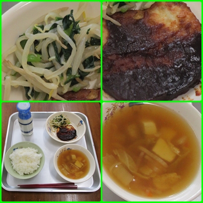 ごはん、ぎゅうにゅう、あいちのとうふハンバーグはっちょうみそソースかけ、こうなんこまつなのおひたし、あいちけんさんいわしのつみれじる です。