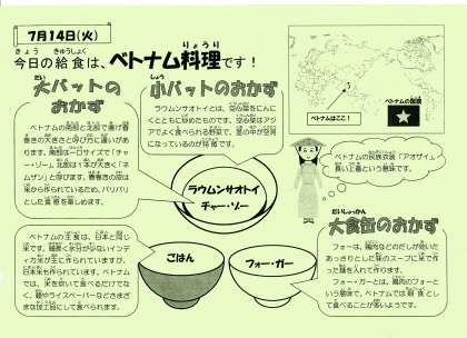 ベトナムは南北に細長く、各地で料理の味付けに特徴があります。北部はしょうゆで塩辛く、中部は唐辛子で辛く、南部は砂糖で甘く味付ける料理が多いようです。