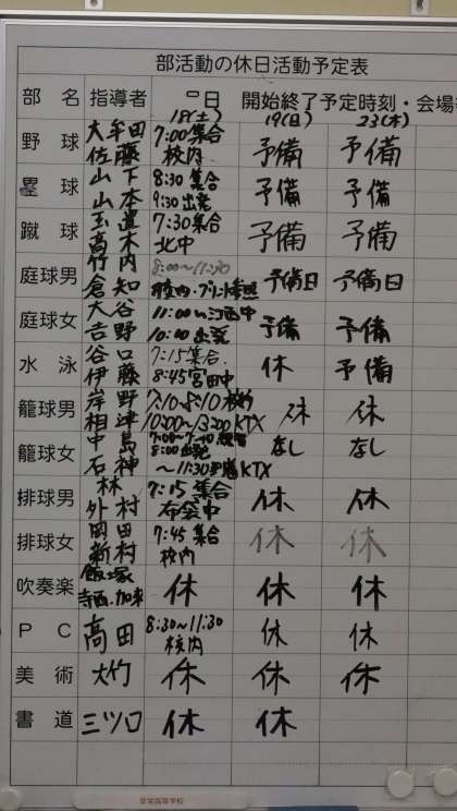 休日の部活動の予定です。