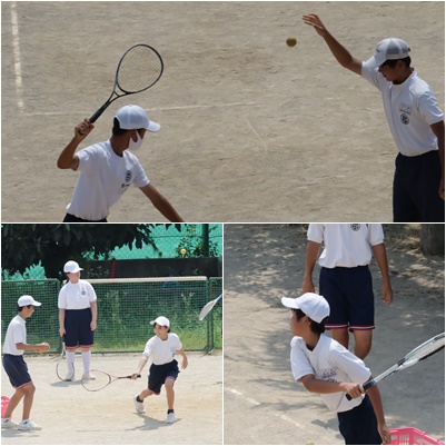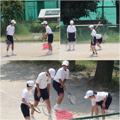 2年生は、体育でテニスの授業を行っていました。ラケットにボールを当てて、相手のコートへ入れる練習をしていました。テニス部に所属している生徒は、とても上手に友達をリードしていました。