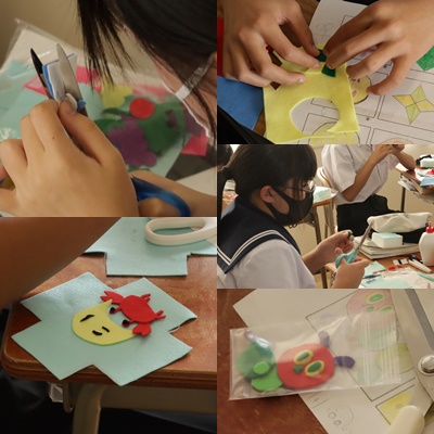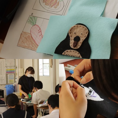 2年生は、家庭科で「お遊びキューブ」の作製を行っています。自分でデザインしたもキャラクターを、フェルト布を切ったり縫ったりしながら作っていきます。とても器用に細かな作業を行っていました。