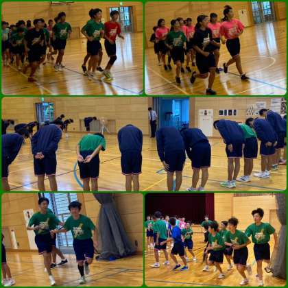 体育館にてストレッチ、8ラン、襷の継走を行いました。