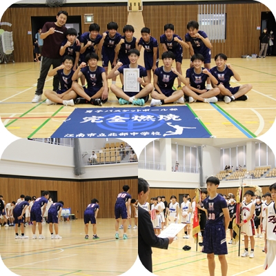 迎えた3位決定戦の相手は扶桑中。秋の新人戦の3決と同じ相手。これまで練習試合で何度も戦ってきたライバルです。序盤からシーソーゲームの激しい展開。相手のオールコートDFにひるむ場面もありましたが、負けじとこちらもプレッシャーDFからの速攻で得点を重ねていきます。準決勝とは打って変わって、全員がバスケットにアタック。シュートを外す場面も多々ありましたが、みんなでリバウンドを取って入るまで打ち続ける。ボールを取られたらみんなで取り返す。これぞ、北中バスケという姿を体現してくれました。試合の最大のハイライトは3Q残り2分30秒。エースキャプテンの00番が痛恨のファウル4つで交代。相手ベンチは大盛り上がりです。「ここで気持ちが引いたら負ける。」「キャプテンが戻ってくるまで踏ん張るぞ!」「もう、1人だけに頼っているとは言わせない!」残りのメンバーが一念発起。炎の全員バスケットで相手エースがいるにも関わらず、3点差のリードを守り切りました。これで流れは一気に北中へ。最終Qはキャプテンが復帰、柱となって活躍。しかし、1人だけでなく、他のメンバーが相手エースのアタックを死守。チームに勢いを与える3Pを連発。まさに、総力戦。最後はキャプテンのフリースローと安定したキープ、5点差の激闘を勝ち切りました。西尾張大会出場決定です!!応援していた先生からは「準決勝と別のチームに見えました。」という言葉。本来の姿を見せられた決定戦でした。