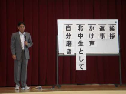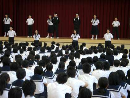 6月6日(月)の朝礼で行われた「管内陸上選手激励会」の様子です。選手の代表から決意表明があり,その後,有志で結成された応援団による激励が行われました。11日(土)に県営一宮総合グランドで行われるの大会当日には,練習の成果を発揮してくれることと思います。