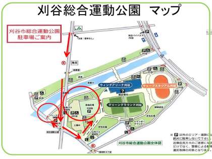・地図上のPの部分か自由広場にお願いします。障がい者用のスペースには絶対に駐車しないようにお願いします。