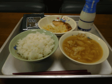 本日の献立は「ごはん」「鮭の塩焼き」「たくあん和え」「牛乳」「すいとん」「手巻きのり」です。