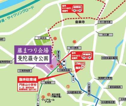 期間中は、早咲きから遅咲きの中にも、紫・紅・白と様々な色や、房は長く優雅な花房・短く可憐なもの・八重咲きのものと、たくさんの種類があり、園内の約60本が色鮮やかに咲き誇ります。藤の甘い香りを静かに楽しみたいのであれば、まだ誰もいない早朝がおすすめです。また、昼間は各種イベントが開催され、お祭りの雰囲気をお楽しみいただけます。
