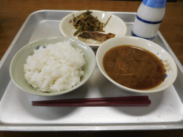 本日の献立は、「ごはん」「めばるの塩焼き」「ふきと豚肉のきんぴら」「牛乳」「あさり汁」です。