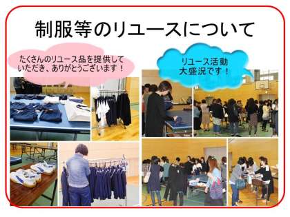 ・各家庭で不要となった、学生服・セーラー服を回収し、必要としている新入生及び在校生にリユースし、資源の有効活用を図る。