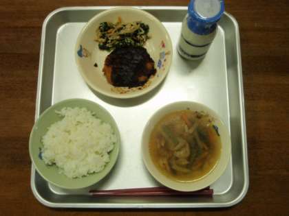 本日の献立は、「ごはん」「みそカツ」「ほうれん草とささみの和え物」「牛乳」「山菜のすまし汁」です。
