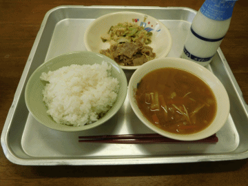 本日の献立は「ごはん」「ゆで豚の甘酢かけ」「茎わかめのツナあえ」「牛乳」「しんじゃがの味噌汁」です。