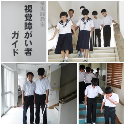 アイマスクで目をふさぎます。そして、杖をつきながら校舎内を歩きます。