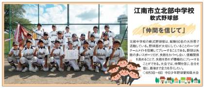 「北部中学校の軟式野球部は、総勢50名の大所帯で活動している。野球部が大切にしていることの一つがチームメイトを信頼してプレーすることである。野球は失敗の多いスポーツだが、失敗をカバーし合い、信頼関係を高めることで、失敗を恐れず積極的にプレーすることができる。大会では、仲間を信じ、自分を信じ、最後まで全力を尽くしたい。