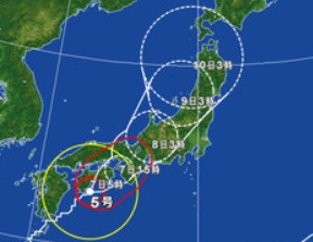 おはようございます!台風5号は予想以上に東よりのコースを移動しています。自転車並のスピード ノロノロ運転です。上空に偏西風が吹いていれば、自動車並みのスピードになりますが・・・そのため、長い間居座り、長時間にわたって、暴風・大雨となります。要警戒です。東海地方に最も接近するのは深夜になると思います。しかし、接近にともない、雨雲の発達でお昼頃から大雨になります。時間雨量80ミリ以上の猛烈な雨を覚悟しないといけないかもしれません。大きな災害とならないことを祈るばかりです。