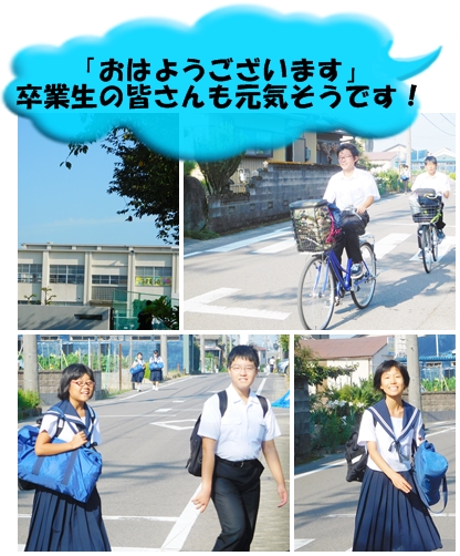 朝、学校の前の道路に立ってあいさつ運動をしていると西から東へと自転車に乗った卒業生たちが通っていきます。