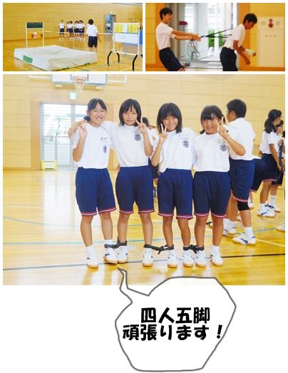 四人五脚に参加する生徒のみなさんの笑顔がいいですね。楽しそうです。