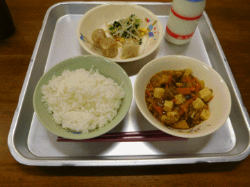 本日の献立は「ごはん」「しゅうまい(小2コ 中3コ)」「マーボー野菜」「牛乳」「中華サラダ(中華ドレッシング)」です。