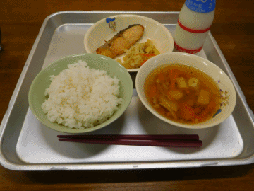 本日の献立は、「ごはん」「鮭の幽庵焼き」「彩りの野菜のおかか炒め」「牛乳」「赤目のおすまし」です。