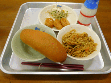 本日の献立は「ミニロールパン」「焼きそば」「豆腐団子(小2コ 中3コ)」「牛乳」「ごぼうサラダ(にゅうたまごなしマヨネーズ)」です。