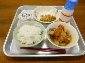本日の献立は「ごはん」「豆腐のしょうゆかけ(しょうゆ)」「里芋のうま煮」「牛乳」「はなきり大根のはりはり漬け」です。
