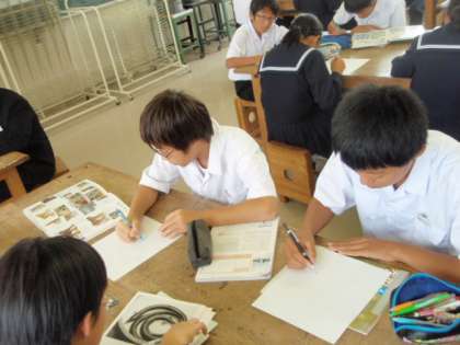 「日本(和風)をテーマに下書きをしよう」という2年生の美術の授業です。図鑑や絵を見ながらみんな真剣にスケッチをしていました。