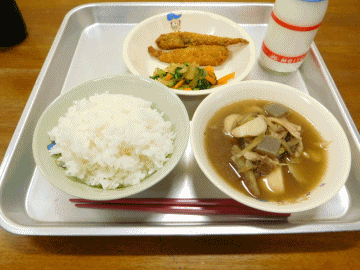 「ごはん」「はたはたのフライ(小中2コ)」「芋煮」「牛乳」「おみづけ」です。