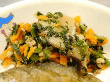 本日の献立は、「ごはん」「ニジマスの唐揚げ」「漬け菜の炒め物もの」「牛乳」「ほうとう」です。
