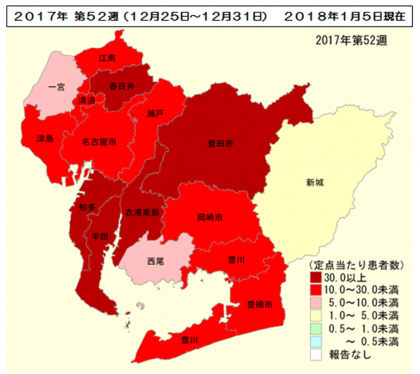 インフルエンザ罹患者は愛知県内で増加しています。インフルエンザA型・B型どちらも見られるようです。今後、さらに寒くなってきますので、体を冷やさないよう気をつけ、手洗い・うがい、マスクでインフルエンザを予防していきましょう。
