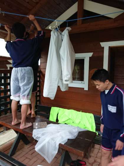 びしょ濡れになった服をロープをはり、乾かしてます。さすが!
