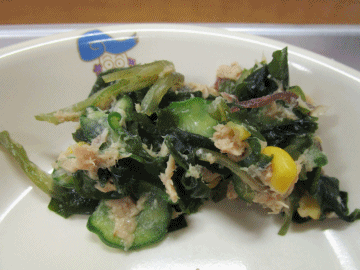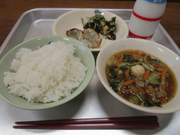本日の献立は、「ごはん」「小松菜まんじゅう(小1コ 中2コ)」「愛知の八宝菜」「牛乳」「海藻サラダ」です。