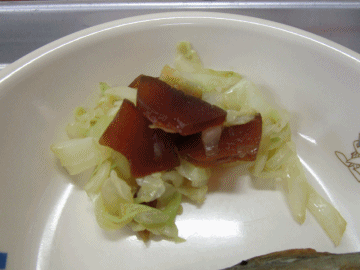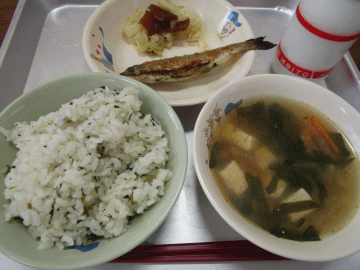 本日の献立は、「愛知のだいこんばごはん」「鮎の塩焼き」「かりもりの和え物」「牛乳」「江南野菜のすまし汁」です。