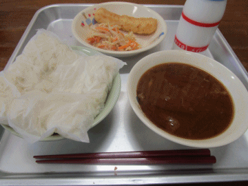 本日の献立は、「味噌きしめん」「いかのてんぷら」「牛乳」「もやしのささみ和え」です。