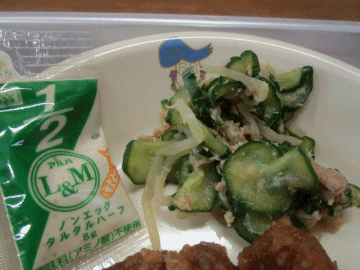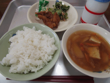 本日の献立は「ごはん」「チキン南蛮(にゅうたまごなしタルタルソース)」「きゅうりのツナあえ」「牛乳」「かねんしゅい」です。