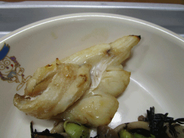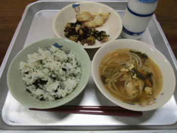 本日の献立は、「わかめごはん」「かわはぎの照り焼き」「ひじきとさつまいもの煮物」「牛乳」「むらくも汁」です。