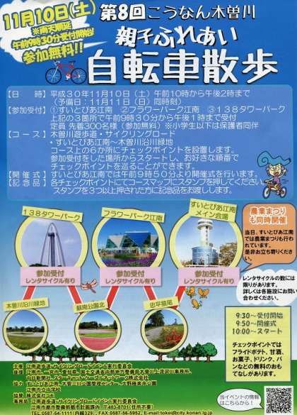 11月10日(土)午前10時から午後2時まで、親子ふれあい自転車散歩がすいとぴあ江南をメイン会場にして、開催されます。