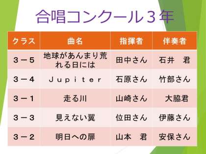 合唱コンクールの発表順は、上記の通りです。