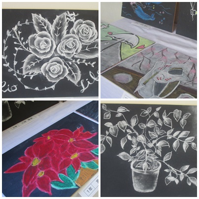 南舎1階廊下に美術部のみなさんの作品が展示されています。