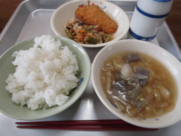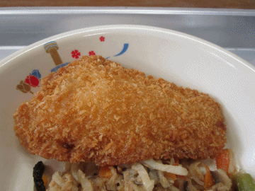 本日の献立は「ごはん」「かさごのフライ」「切り干し大根の炒め煮」「牛乳」「のっぺい汁」です。
