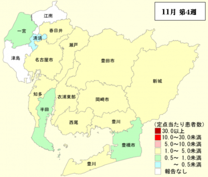 平成30年第48週(11月26日(月曜)から12月2日(日曜)まで)における愛知県内のインフルエンザ患者の定点医療機関当たりの報告数が、1.40となりました。