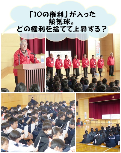 訪問者の紹介のあと、さっそく「権利の熱気球」を見ながら、気球内の権利について考えました。