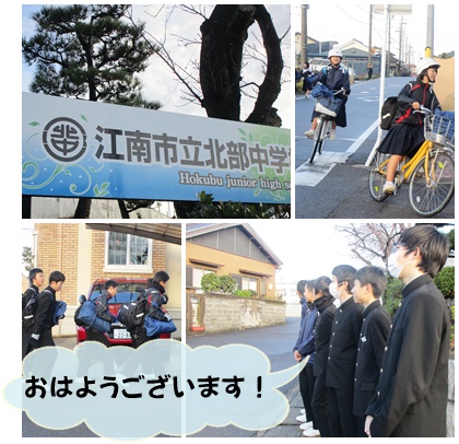 今日は3年3組のボランティアの皆さんがあいさつ運動に参加しています。