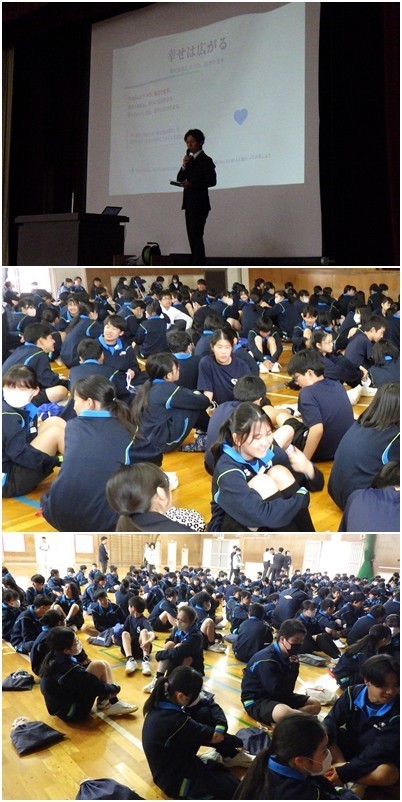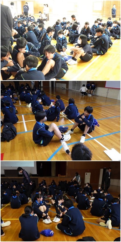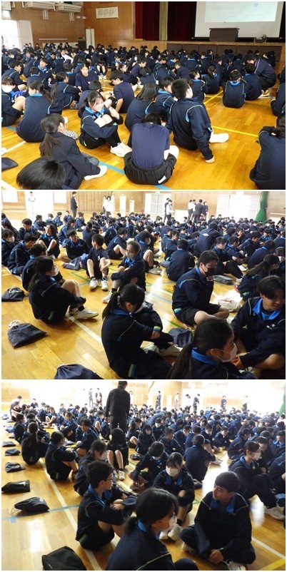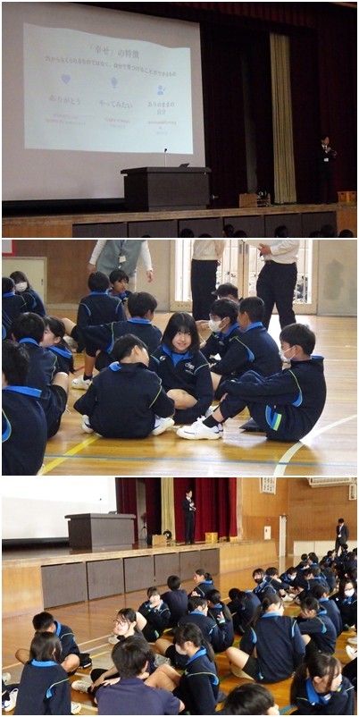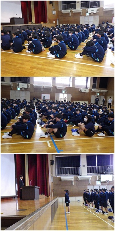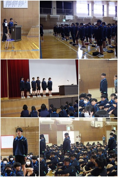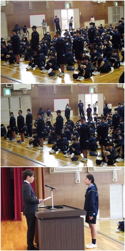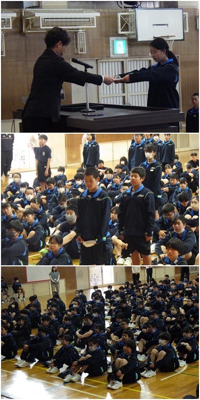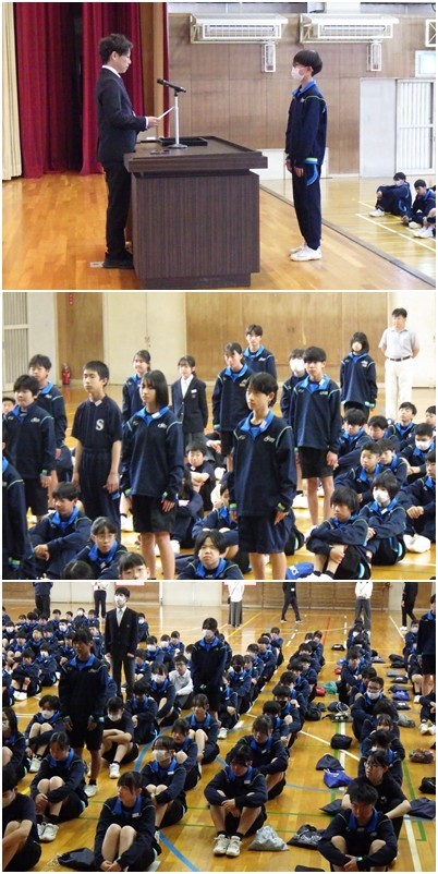全校集会の様子です。学級役員、委員長の任命席を行いました。