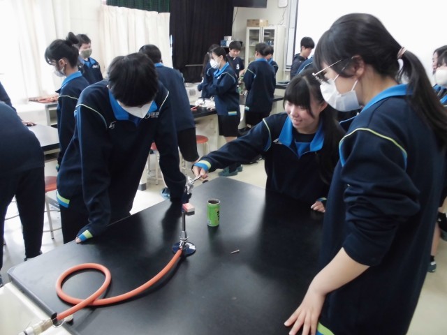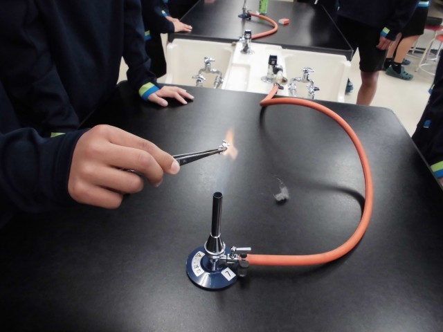生徒たちは、ガスバーナーで加熱し、「燃えるのか、燃えないのか」を自分の目で確かめました。さらに、燃やす前と燃やした後の質量を測定し、その変化にも着目しました。