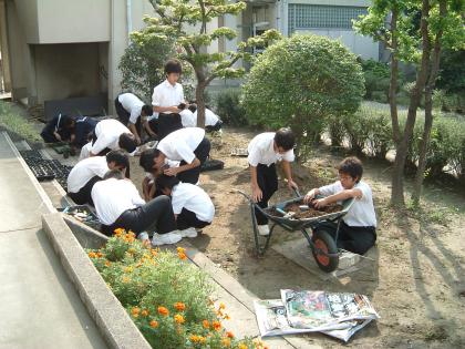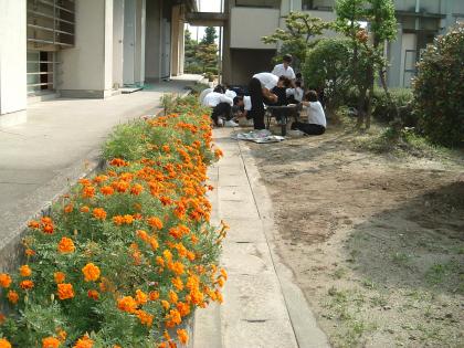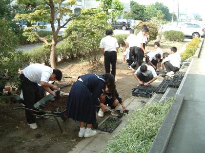 西部中の花壇はマリーゴールドが花盛りです。そんな中,次のPTA花いっぱい運動に向けて,パンジーの鉢あげを2年生選択技術の授業でおこないました。生徒たちは一生懸命作業に取り組み約300株作ることができました。この後,3年生の選択技術や緑化委員会でさらに200株ぐらい作る予定です。