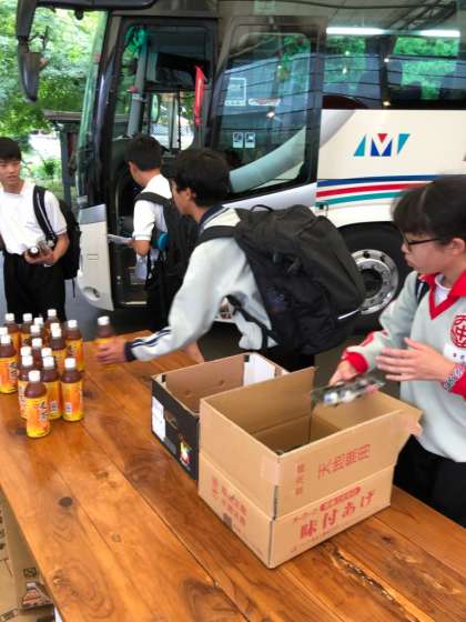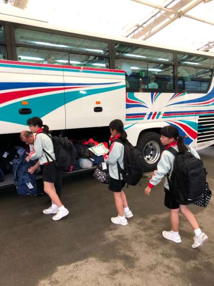 大きな荷物をバスに乗せて、お弁当を受け取ってバスに乗り込みます。