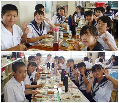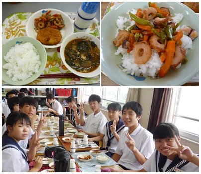 今日は半夏生にちなんだ給食です。ご飯、牛乳、たこ飯の具、枝豆コロッケ、モロヘイヤのみそ汁でした。