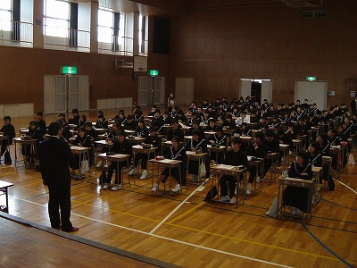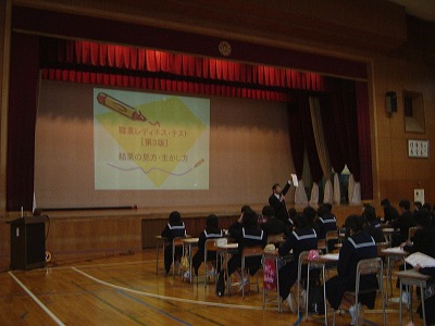 本日5時間目2年生は体育館で学年一斉に進路学習を実施しました。内容は職業レディネステストの結果の見方についてで,愛知県勤労会館能力開発室から講師の先生をお招きして指導を受けました。ご家庭でも是非話題にしていただきたいと思います。