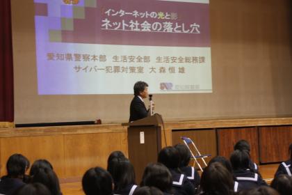テストが終了しました。4時間目はメールによるいじめをテーマにした人権問題を考えるビデオを全校で見ました。5時間目は愛知県警のサイバー犯罪対策室から講師をお招きして指導を受けました。たくさんの犯罪事例を紹介していただきました。被害者になるだけでなく加害者にもなってしまうことや軽い気持ちでのいたずらが検挙の対象になってしまうことが印象に残りました。テスト後で気がゆるむかと心配していましたが,みんな真剣に話を聞いていました。資料を持ち帰りましたので保護者の皆様もぜひお読み下さい。