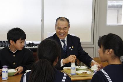 本日3時間目から市長さんが来校され,授業の様子を参観されました。給食の時間は1年1組の生徒と給食をともにされました。