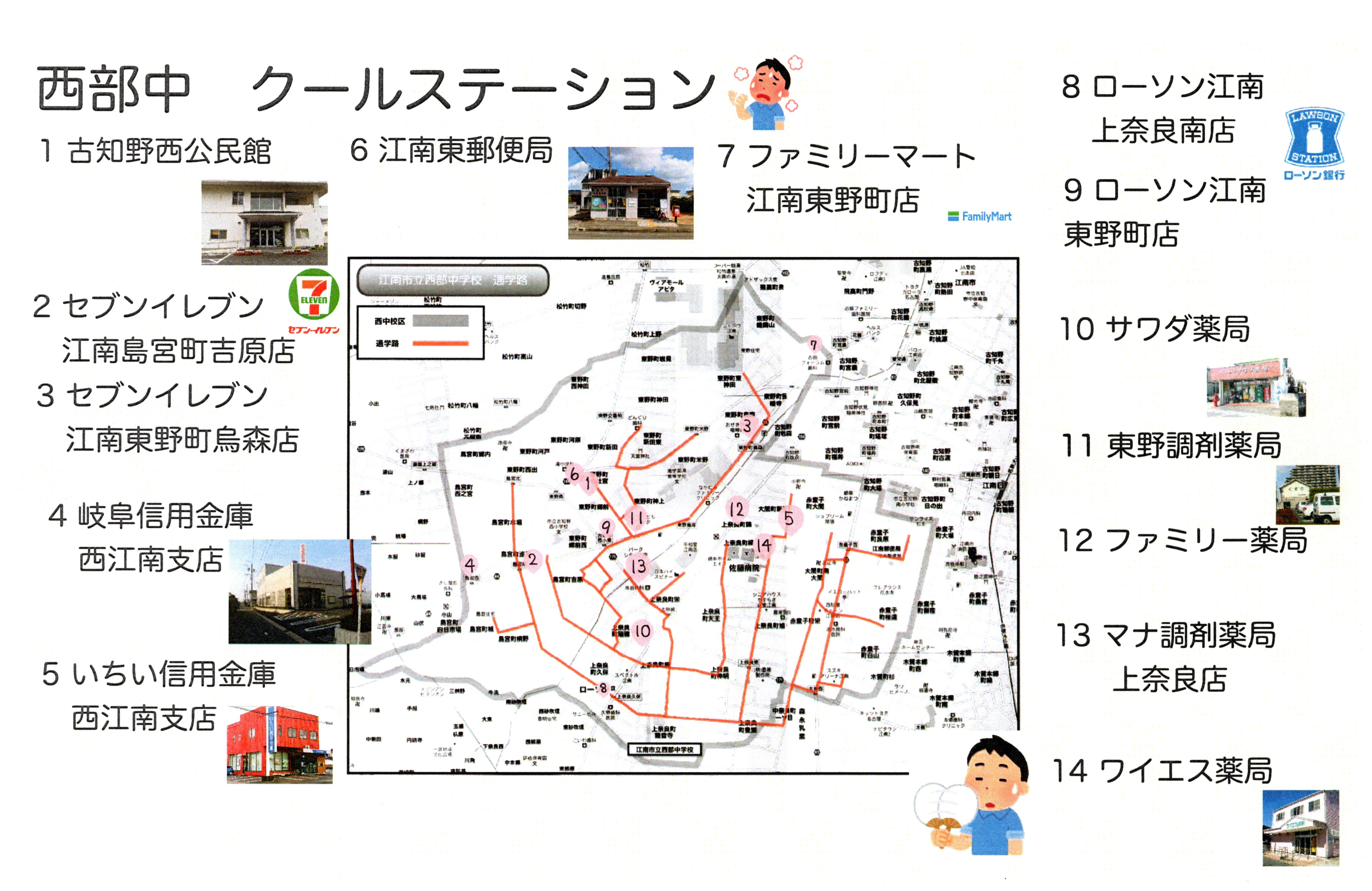 また、今年度も江南市より、登下校時に暑さのため調子が悪くなった体を休めることができるクールステーションを配置していただきました。もしものときに活用できるよう、地図を見て場所を把握しておきましょう。
